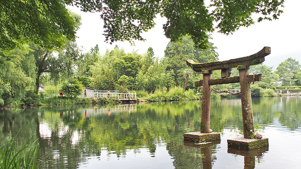 Yufuin is famous for its nature and hot springs. Riding bicycle around, seeing mountains, breathing fresh air, and having hot springs make a perfect relaxing day here. Lake Kirin is a hot spot as well. In the lake, stands a torii. A scene you can just see in Japan.